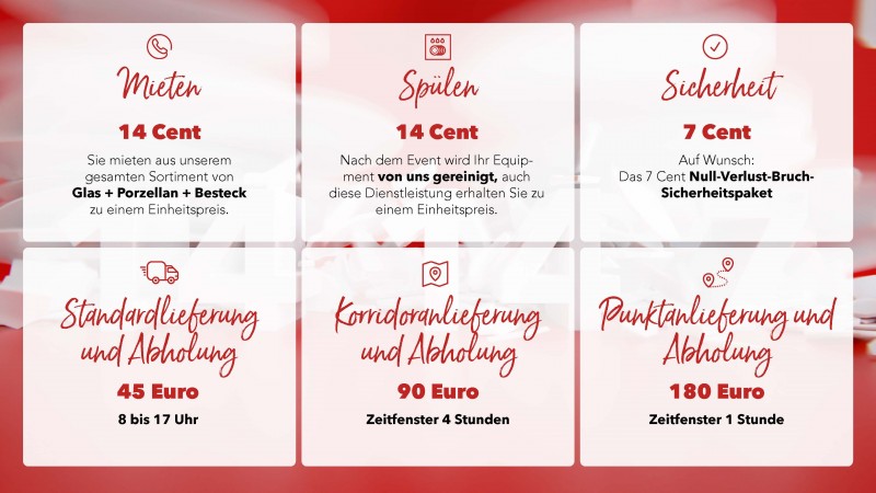 Als Gastgeber ist Ihre To-Do-Liste in der Regel lang. Sparen Sie Zeit und nutzen Sie unseren erprobten Rundumservice – von der Anlieferung bis zur Rückführung Ihrer gesamten Eventausstattung.